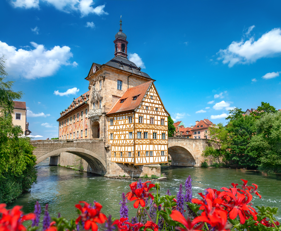Die Altstadt erlebst du am intensivsten zu Fuß. Typisch für Bamberg ist das Alte Rathaus, das scheinbar mitten im Fluss steht und über Brücken mit beiden Ufern verbunden ist. Von hier aus blickst du auf die Regnitz, auf Fachwerkfassaden und auf kleine Inseln. Der Dom auf einem der Hügel dominiert zusammen mit der Neuen Residenz das Stadtbild. Im Rosengarten der Residenz genießt du gepflegte Beete, ruhige Ecken und eine schöne Aussicht über die Dächer. Auf weiteren Hügeln liegen Klosteranlagen, von denen du weit über die Stadt und das Umland sehen kannst. Das Viertel Klein Venedig mit seinen Fachwerkhäusern direkt am Wasser ist ein besonders beliebtes Fotomotiv und vermittelt mit Booten und Balkonen ein fast südländisches Flair.
