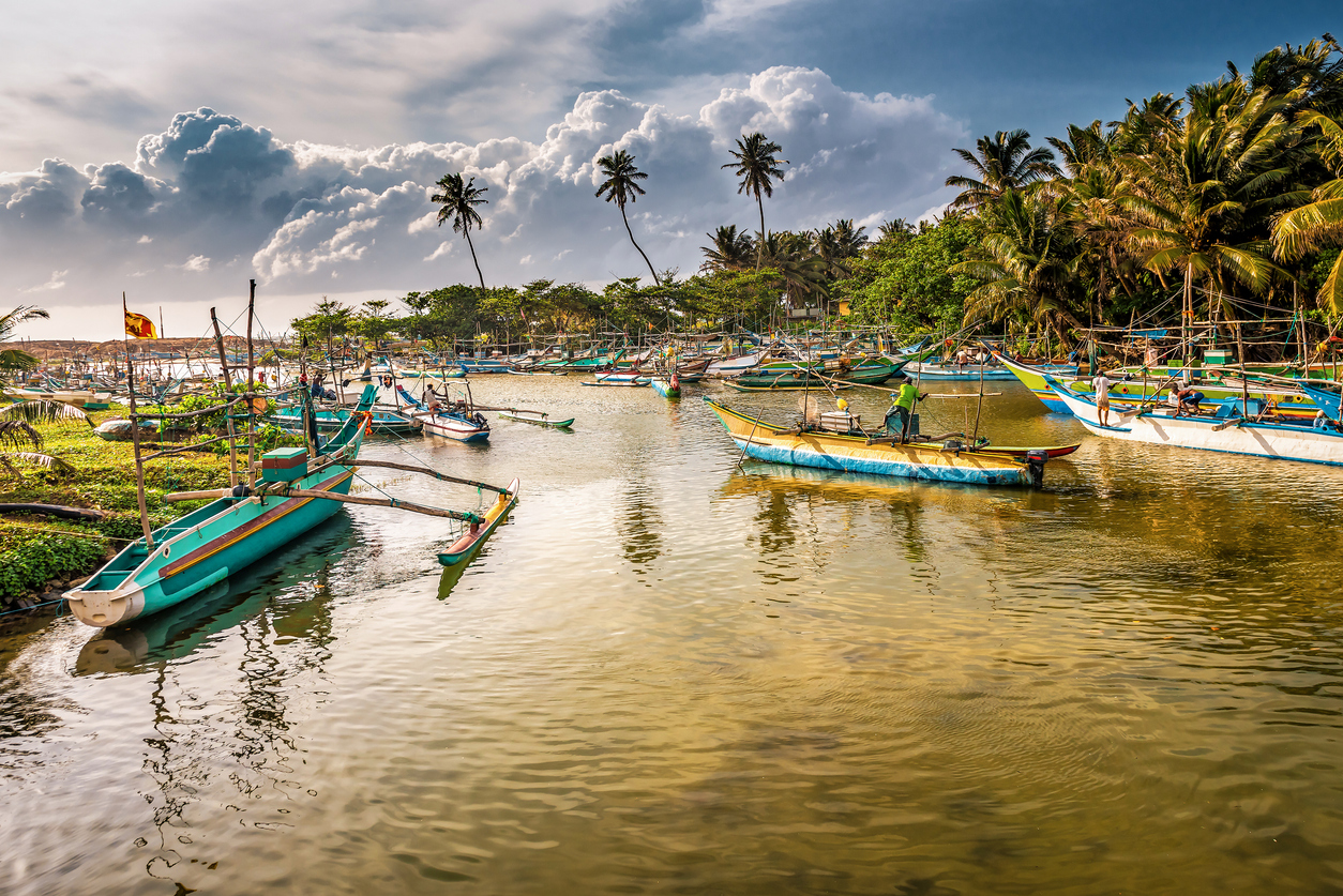 Zahlreiche farbige Ausleger-Fischerboote liegen in einer ruhigen Lagune in Sri Lanka, umgeben von Palmen und dramatischen Wolken.